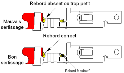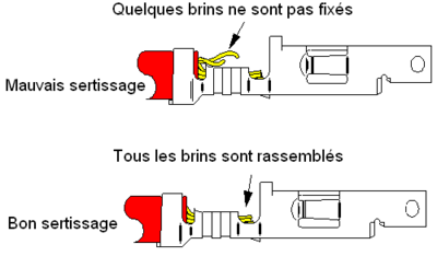 Parfois quelques brins ne sont pas fixés dans la cosse, cela réduit la solidité du connecteur ainsi que sa capacité de transport du courant. Pour éviter ce problème, il est conseillé d'enrouler les brins avant de sertir.