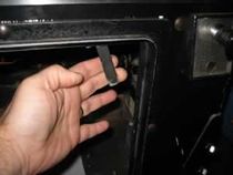 2) Cherchez le levier de déverrouillage de la manchette sur la droite de la porte ouverte (consultez les photos ci-dessous). C'est lui qui maintien la manchette plaquée sur le bas de la vitre du plateau.