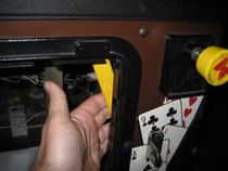 Ensuite, attrapez le plateau, là où les billes sont perdues (apron) et soulevez-le. La plupart des jeux possèdent une tige située sur le côté droit de la caisse. Cette tige est utilisée pour maintenir le plateau relevé, comme montré sur la photo ci-dessous. Elle est similaire à la tige qui permet de maintenir ouvert le capot des voitures.