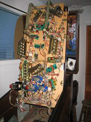 Le plus souvent, le plateau doit d'abord être tiré vers l'avant. Parfois, il est possible de le faire en attrapant des poignées/supports sous le plateau, comme on peut en trouver sur les Data East/Sega/Stern (voir photo ci-dessous). Sur d'autres jeux, tels que les Bally/Williams des années 90, il est plus facile de passer sur le côté de la machine, d'attraper le plateau et de le faire coulisser vers la position du joueur (vers la zone du lanceur), puis de le faire basculer au-delà de la position verticale, jusqu'à ce qu'il repose contre le fronton.